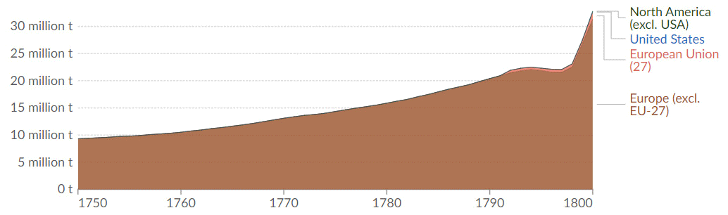 以上圖為例,根據Our World in Data資料,近年來美國和歐洲的碳排放量不斷下滑,但中國和印度等發展中國家排放量卻迅速增加。除了因為經濟成長導致交通、製造、基礎建設等需求大增,還有部分原因是海外國家設廠所致的碳洩漏。