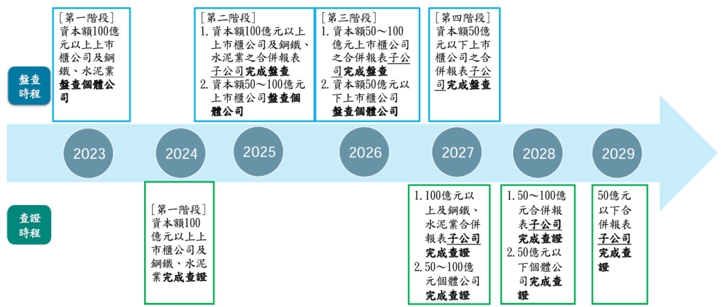 配合國家2050淨零碳排路徑,金管會業於2022年3月3日發布「上市櫃公司永續發展路徑圖」,分階段推動上市櫃公司揭露溫室氣體盤查及確信資訊,建構企業溫室氣體盤查能力。