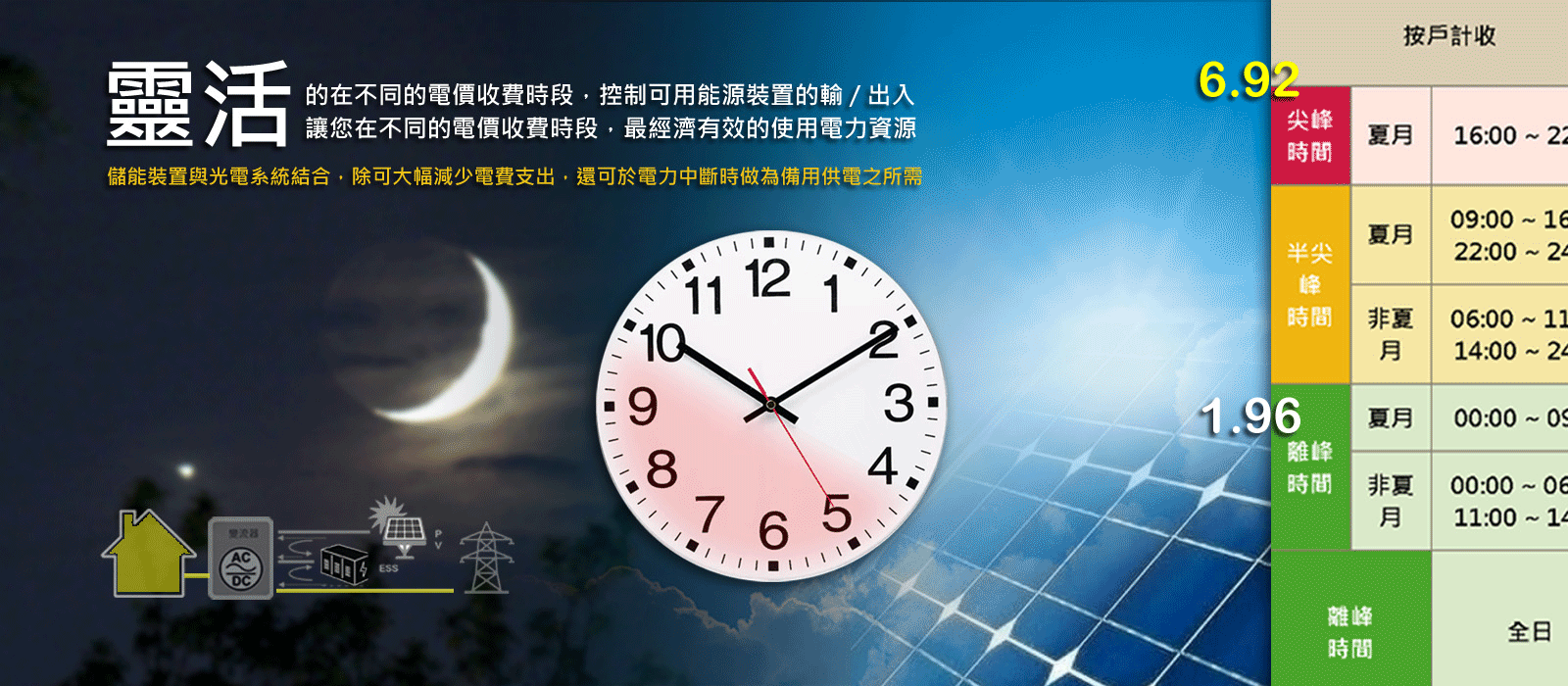- 時間電價中之尖峰時段(16:00~22:00)電價高達 6.92 元/度,約為離峰的 3.5 倍。