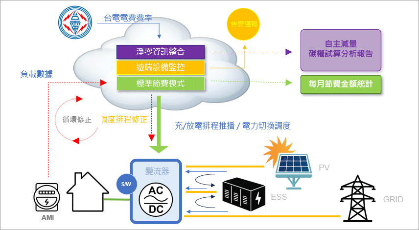 - 系統會依用戶負載回饋與各能源裝置的即時狀態動態調度。